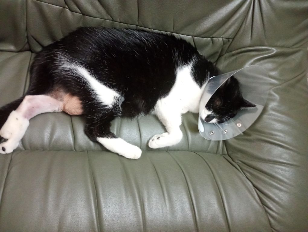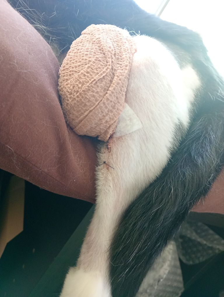 左足の膝部分に突き出た杭を隠すようにガーゼと包帯が巻かれています。傷を舐めないようカラーもつけなければなりません。